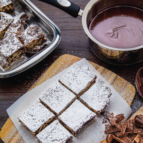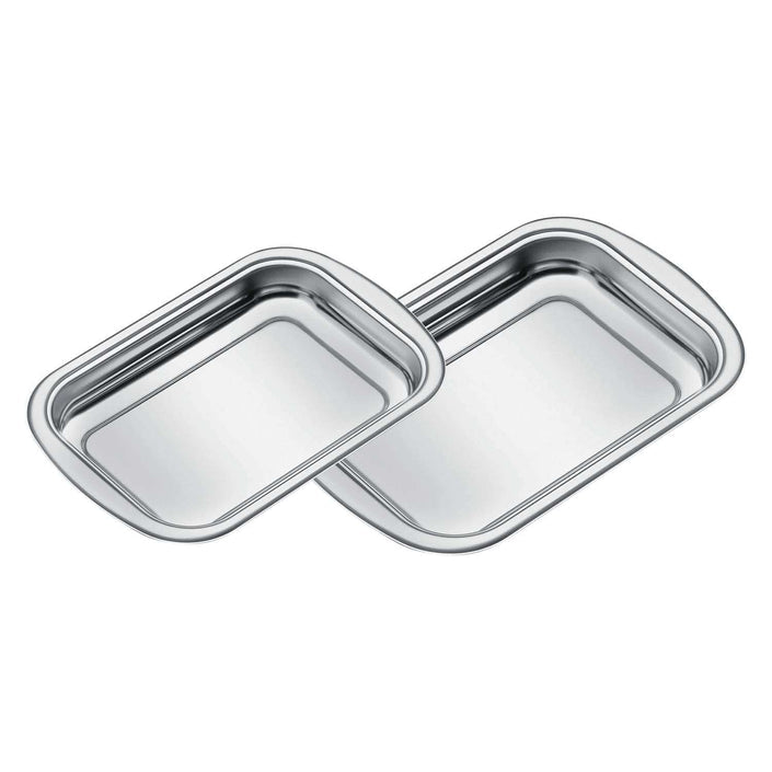 Made from polished stainless steel, they are extremely durable and offer efficient and even heat distribution for numerous baking and roasting requirements. Many other practical features of this set make life so much easier, for example for space saving, easy storage the smaller pan sits perfectly inside the larger one and as well as being ovenproof they are also very easy to clean, either by hand or simply by popping them in the dishwasher.