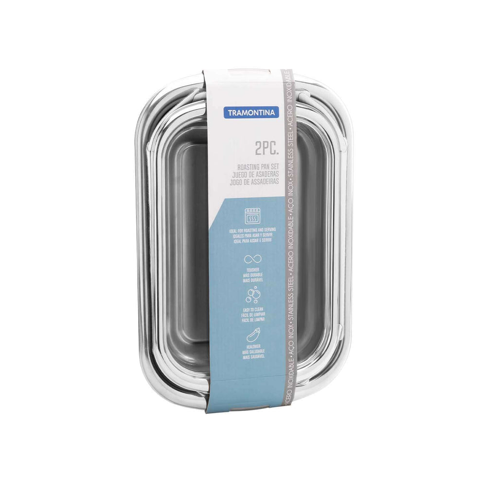 Offering incredible versatility and efficiency, this 2-piece roasting pan set comprises one deep roasting pan measuring 29cm long with a capacity of 1.5l and the other measuring 34cm with a capacity of 2.2l.