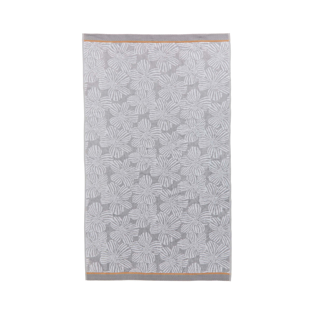 A white and grey elegant all-over floral design in white and soft grey. The towel is trimmed with a woven chevron design hem to the top and bottom. In super-soft 100% cotton velour to the front with a terry cotton reverse, this beautiful towel is treated with an anti-piling treatment for long-lasting quality.