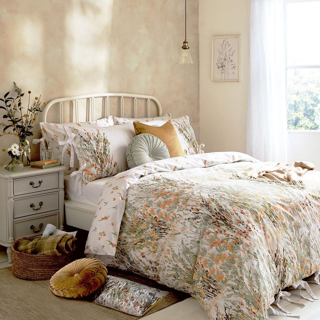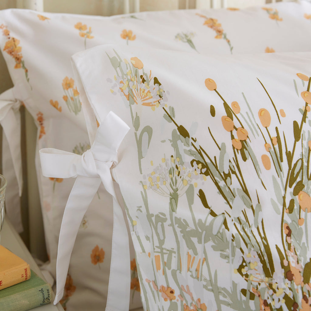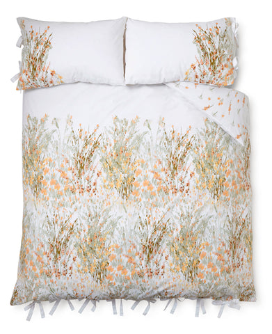 Charismatic and charming, the striking Harvest bedlinen incorporates traditional British flowers amongst tall wild grasses, giving a delightful look of classic country charm. Printed onto soft cotton with  delicate sprig reverse and beautiful cotton ties  for added detail.