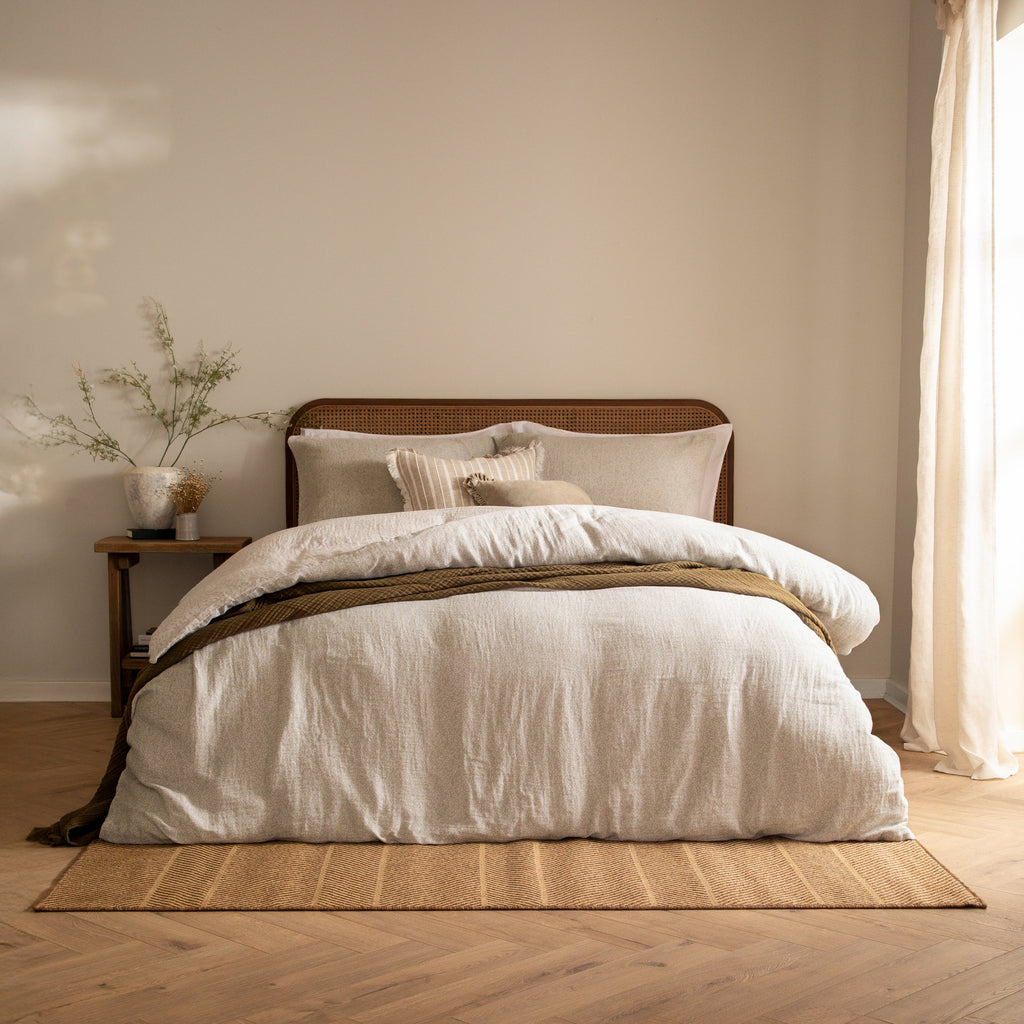 The Perrie Leaf Duvet Cover Set blends natural beauty with effortless comfort. Crafted from ultra-soft double-layered muslin cotton, it features a reversible ditsy leaf print in a neutral palette, evoking a relaxed and natural aesthetic. The contrasting smaller-scale design on the reverse allows versatility in styling while maintaining the same soft muslin texture. Perfectly suited to those valuing simple yet high-quality materials, this bedding fosters a connection to nature with its breathable cotton fabric and laid-back appeal. A versatile and thoughtful addition to any space.