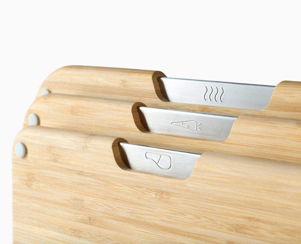Perfect for storing on countertops, this durable bamboo chopping board set features three double-sided boards and a compact metal storage stand. To help avoid cross-contamination, the boards come with food-specific icons for preparing raw meat, vegetables and cooked food separately.