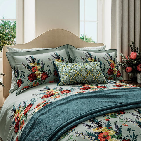 The vibrant floral bouquet pattern adorning this duvet set has been adapted from a 20th-century upholstery fabric from the British firm Morton Sundour's 'Cumberland Prints' series, held in the V&A's collection of textiles and fashion.
