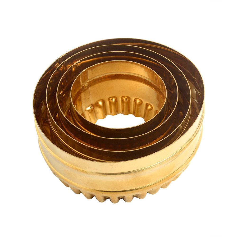 Set of 4 round brass coated fluted cookie cutters. Complete with hanging ring. Sizes 4cm to 8cm