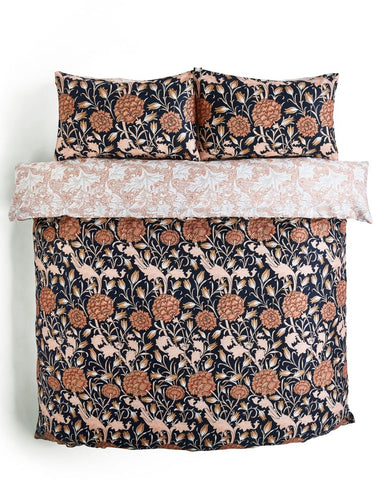 Immerse yourself in this beautiful 220 thread count cotton sateen bed set, where small wild tulips sit amongst ribbons of larger peonies intertwining with scrolling stems and leaves, in this spring-inspired design by William Morris. The William Morris Gallery’s collection includes original hand block printed wallpaper lengths of this pattern, designed in 1884, in an array of colour options. Coloured in a rich navy blue and shades of copper and clay, inspired by natural dyes Morris himself would have used, this reversible bedding is elegant and sophisticated. Featuring Morris’ Wallflower pattern on the reverse in a complimentary shade. Available in sizes: single set, double set, king set and Super king set. Set includes duvet cover and 2 pillowcases (Includes 1 pillowcase with single set). Pillowcases available to purchase separately include two in a set.